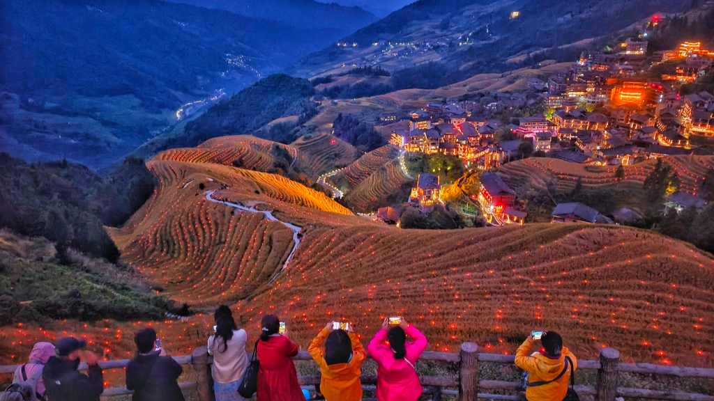 Στις 23 Οκτωβρίου, στην κομητεία Λονγκσένγκ, στο Γκουιλίν της επαρχίας Γκουανγκσί οι τουρίστες θαυμάζουν τη νυχτερινή θέα των ορυζώνων στο Λονγκτζί. Το φθινόπωρο, οι πεζούλες με τους ορυζώνες γίνονται χρυσές, δημιουργώντας ένα υπέροχο τοπίο κατά την περίοδο της συγκομιδής.