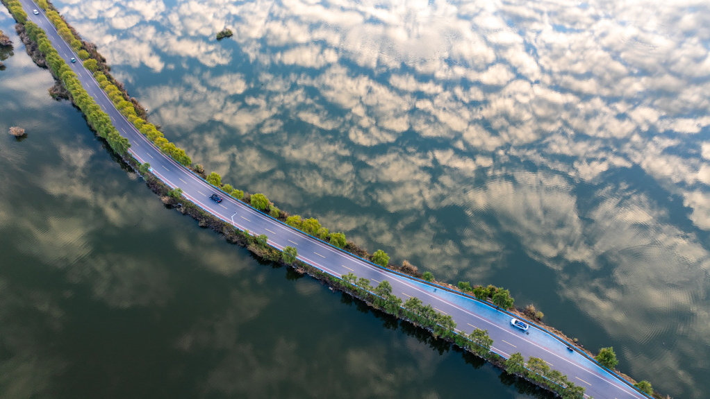 Στις 12 Νοεμβρίου 2025, στην περιοχή Ντουζί της περιοχής Χουάιμπεϊ της επαρχίας Ανχούι, τα αυτοκίνητα διασχίζουν αγροτικούς δρόμους που περνούν πάνω στη λίμνη. Η επιφάνεια της λίμνης, λεία σαν καθρέφτης, αντανακλά τα σύννεφα στον γαλάζιο ουρανό, ενώ ο δρόμος που διασχίζει τα νερά φαίνεται να αναστέλλεται σαν ένας "ουράνιος καθρέφτης", συνθέτοντας ένα τοπίο σπάνιας ομορφιάς.