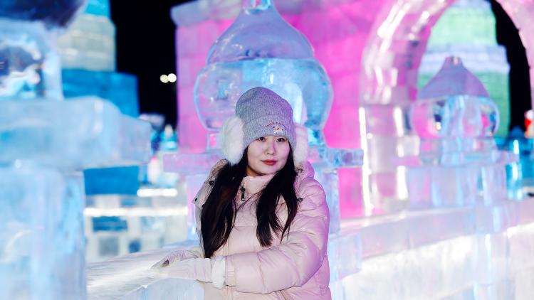 Το λαμπερό παλάτι από πάγο αποτελεί δημοφιλή φωτογραφικό σημείο στο Κόσμο Πάγου και Χιονιού του Χαρμπίν
