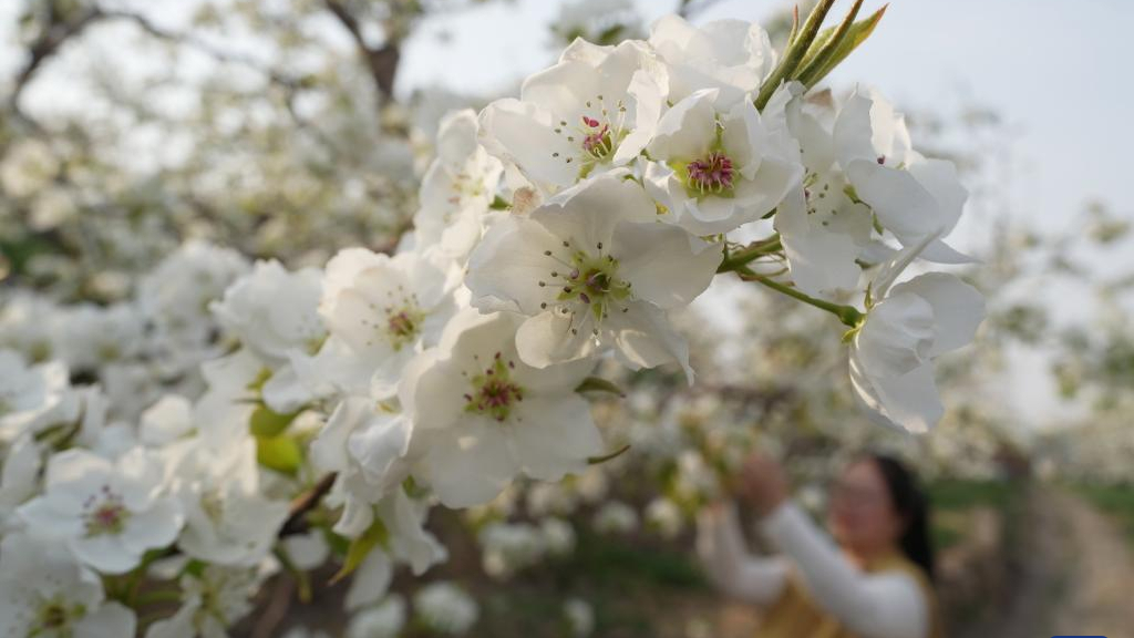 Οι αγρότες σε εργασίες αραίωσης λουλουδιών και επικονίασης καθώς ανθίζουν οι αχλαδιές στο Χεμπέι
